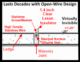 Our bird deterrent system is virtually invisible, using UV protected clear polycarbonate insulators. Avian Flyaway's electronic bird control is air insulated. 99% of the system is virtually invisible and insulated by nothing but the air. Tiny stainless steel wires running parallel just above the surface while floating in the air create the perfect bird control system. Nothing to deteriorate and nothing to clean; it's nothing but invisible stainless steel and air! The material components are proven to last decades in well over 90% of installations; and regular cleaning and maintenance is not required!